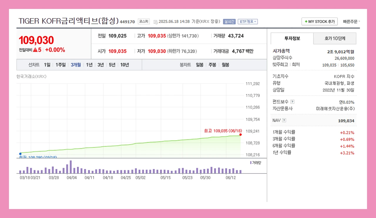 | TIGER KOFR금리액티브(합성) | 국내 단기채·환헤지 | 한국 금리변동 대응, 환위험 방지 | +3.7 | 0.11 |