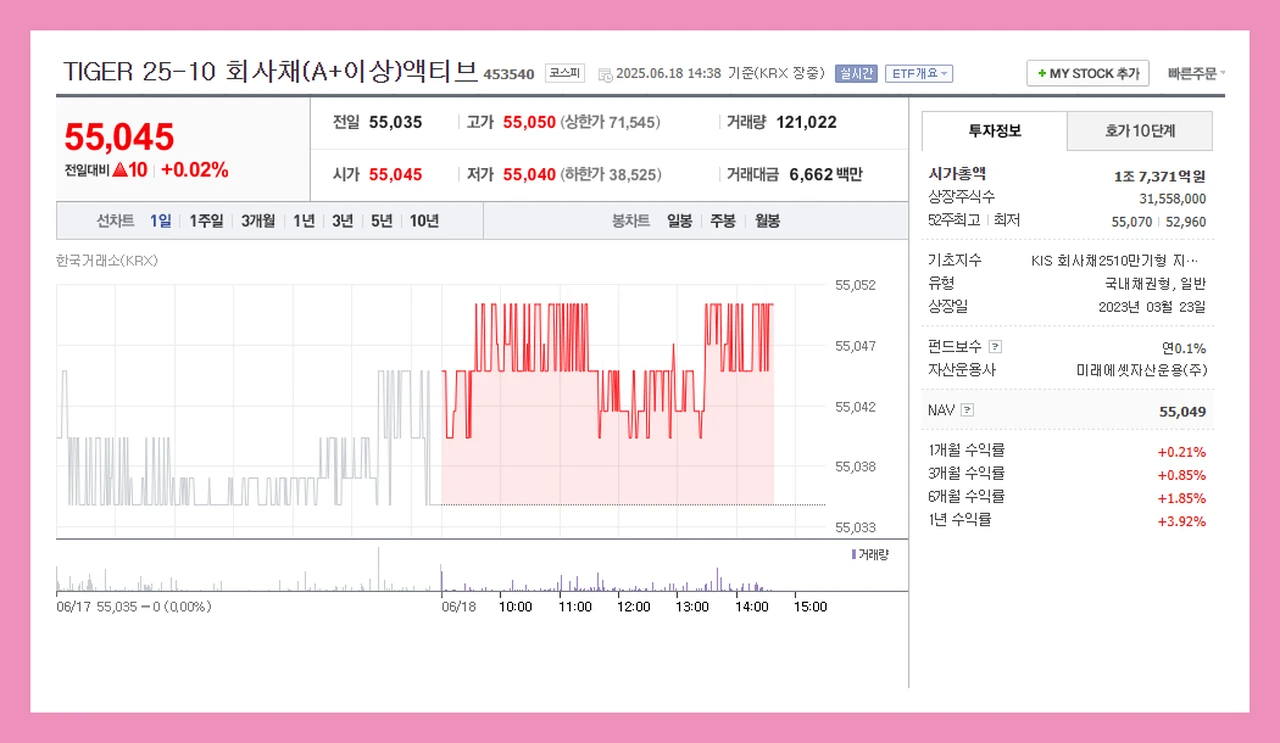 | TIGER 25-10 회사채(A+이상)액티브 | 국내 단기 우량 회사채 | 신용리스크 분산, 단기 안정성 확보 | +3.5 | 0.11 |
