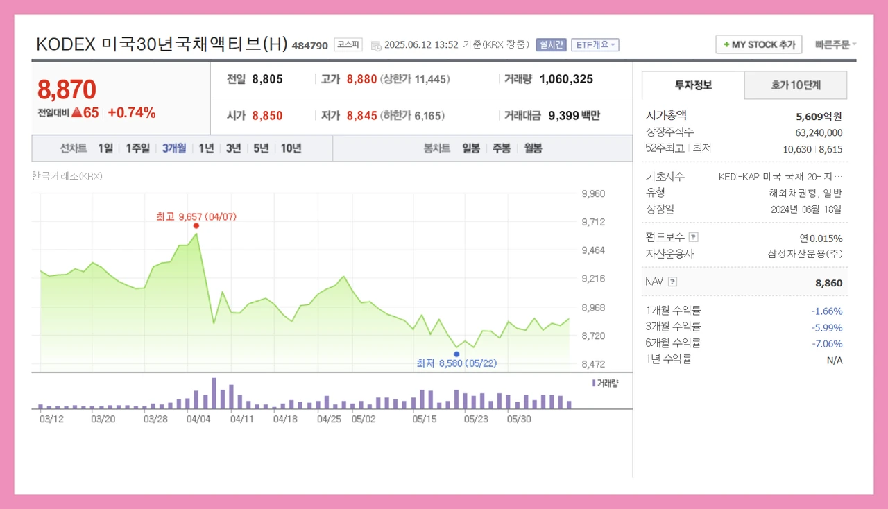 | KODEX | 미국30년국채액티브(H) | 장기국채(월배당) | 미국 30년 만기 국채 | 장기 국채+환헤지, 금리하락 구간 자본수익, 정책 위험 헤지, 월배당 |