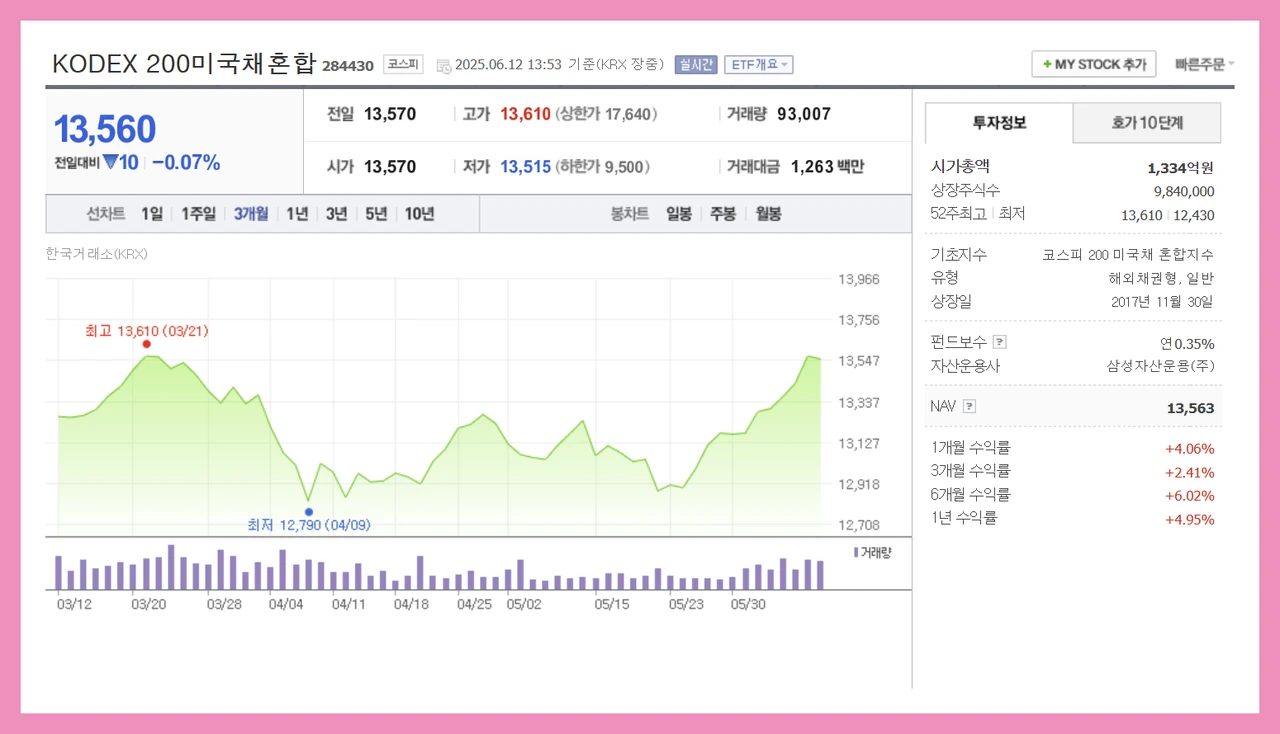 | 국내외 자산혼합 | 10% | KODEX 200미국채혼합 | 주식·채권 복합, 단일 시장 충격 분산 중립화 |