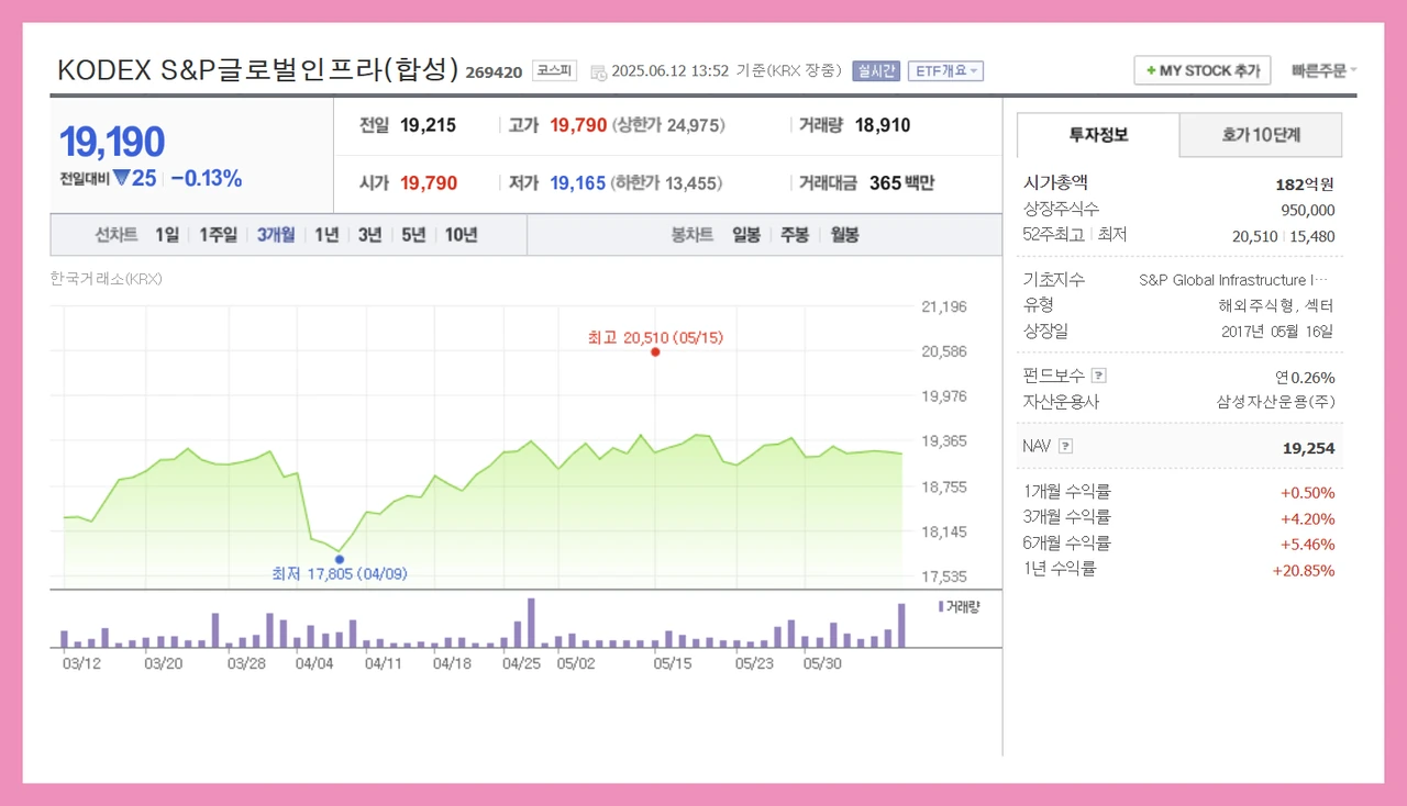 | 글로벌 인프라 | 35% | KODEX S&P글로벌인프라(합성) | 정책변수·공급망 위기 시 방어, 필수 인프라 분산 |