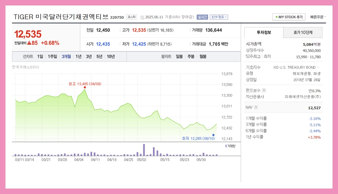 | TIGER | 미국달러단기채권액티브 | 달러표시 단기채 ETF, 채권+달러통화 노출로 변동성 방지 |