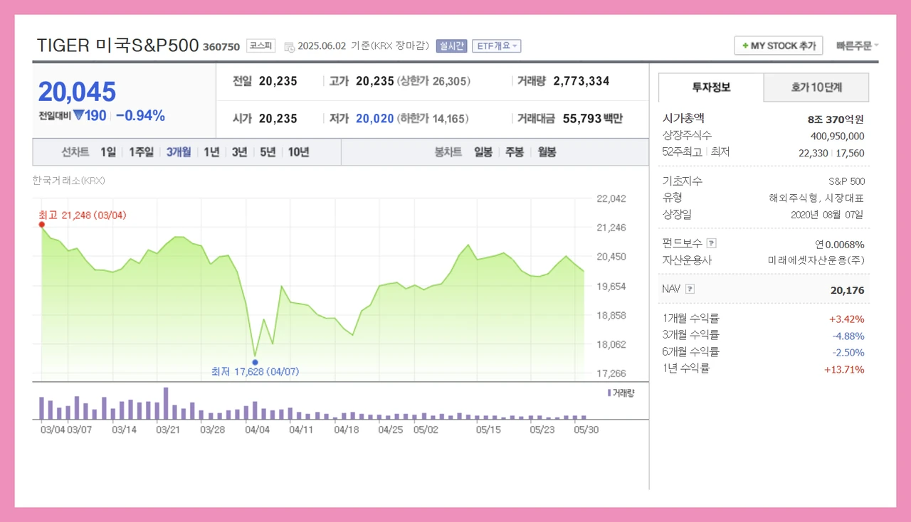| KODEX 미국S&P500 | 미국주식(국내) | S&P500 원화·환노출 | 장기 복리, 환율 헤지 혼합 |
