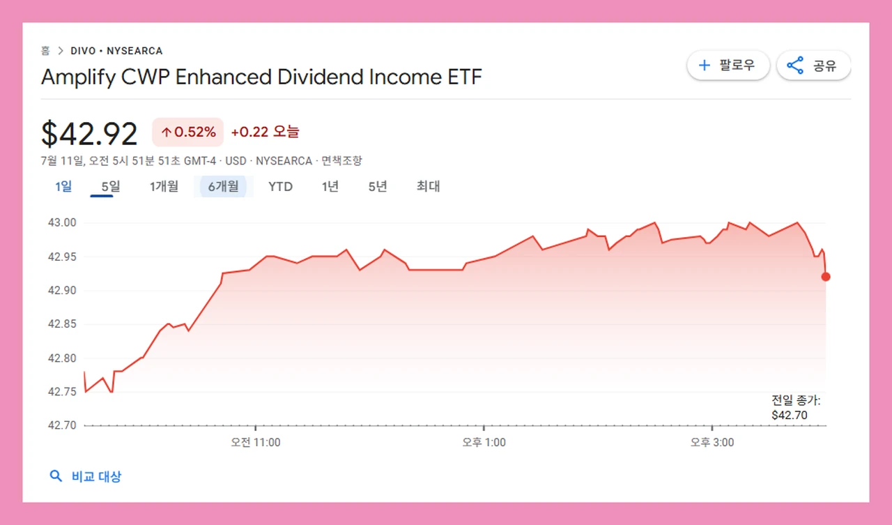 | 글로벌 | DIVO | - | - | - | 5 ~ 6%(추정) | 0.55% | 중간 | 배당성장+커버드콜 전략 |